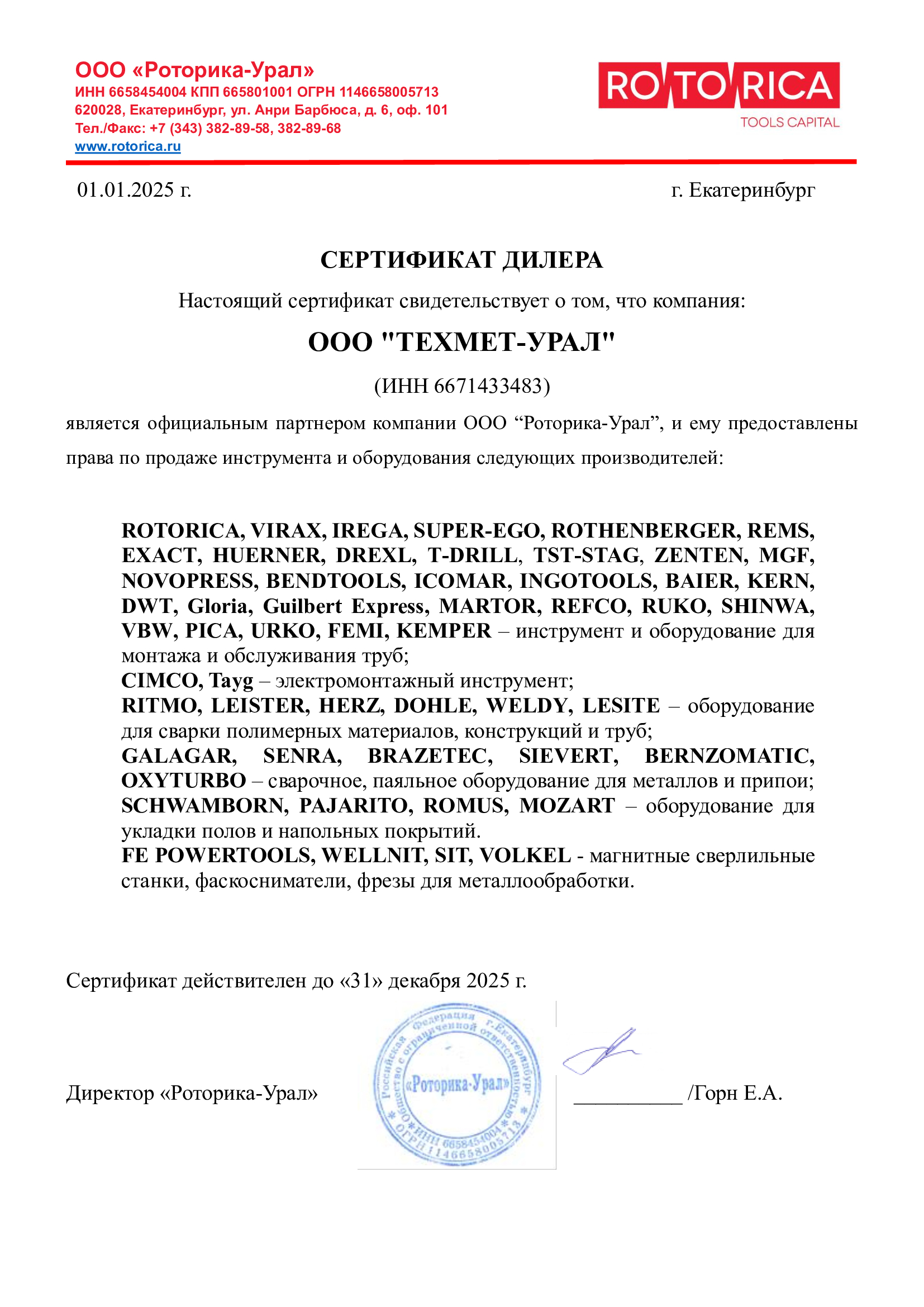Сертификат дилера компании "Роторика-Урал" 982.8 кб