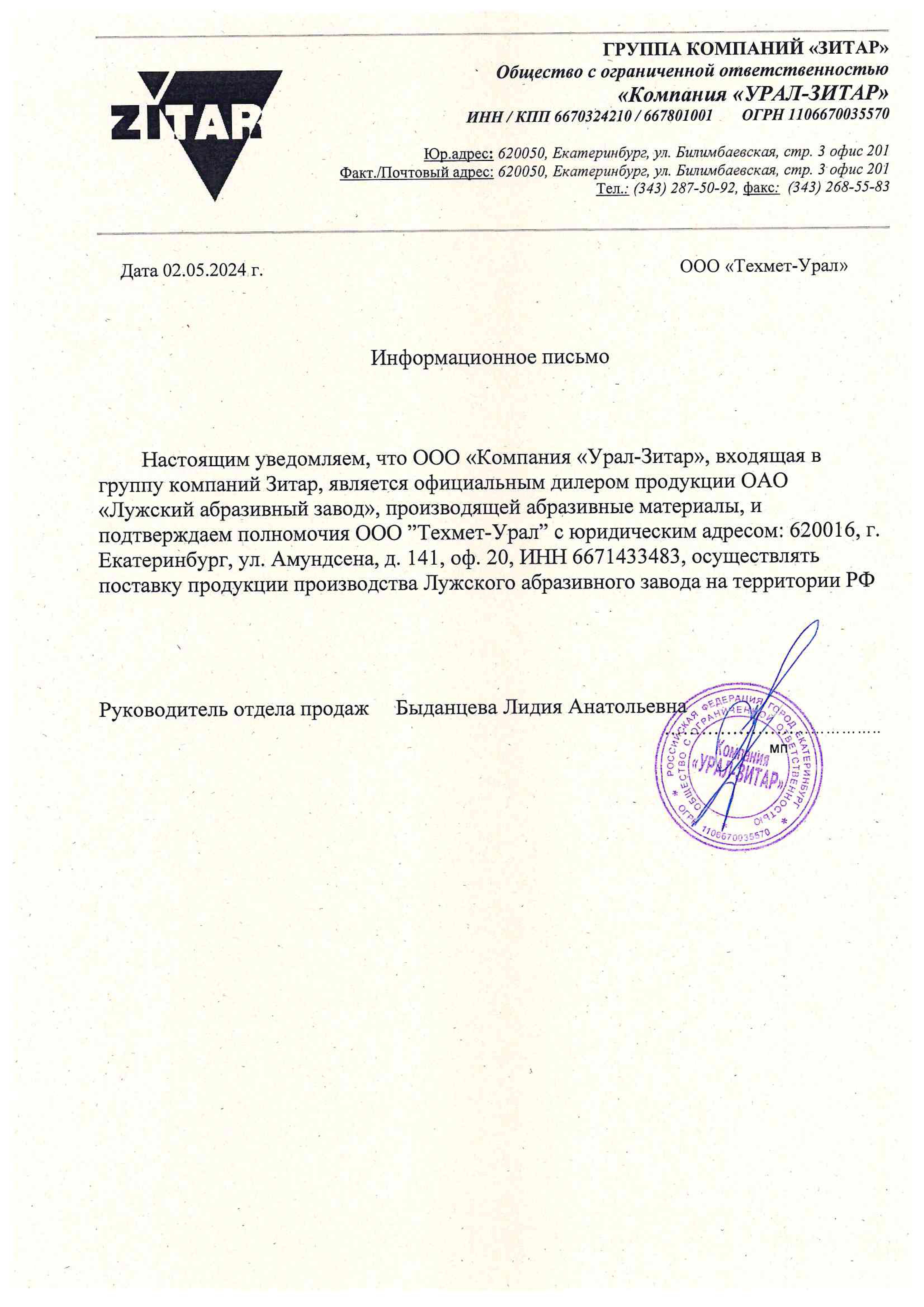 Сертификат дилера Лужского абразивного завода 1.6 мб